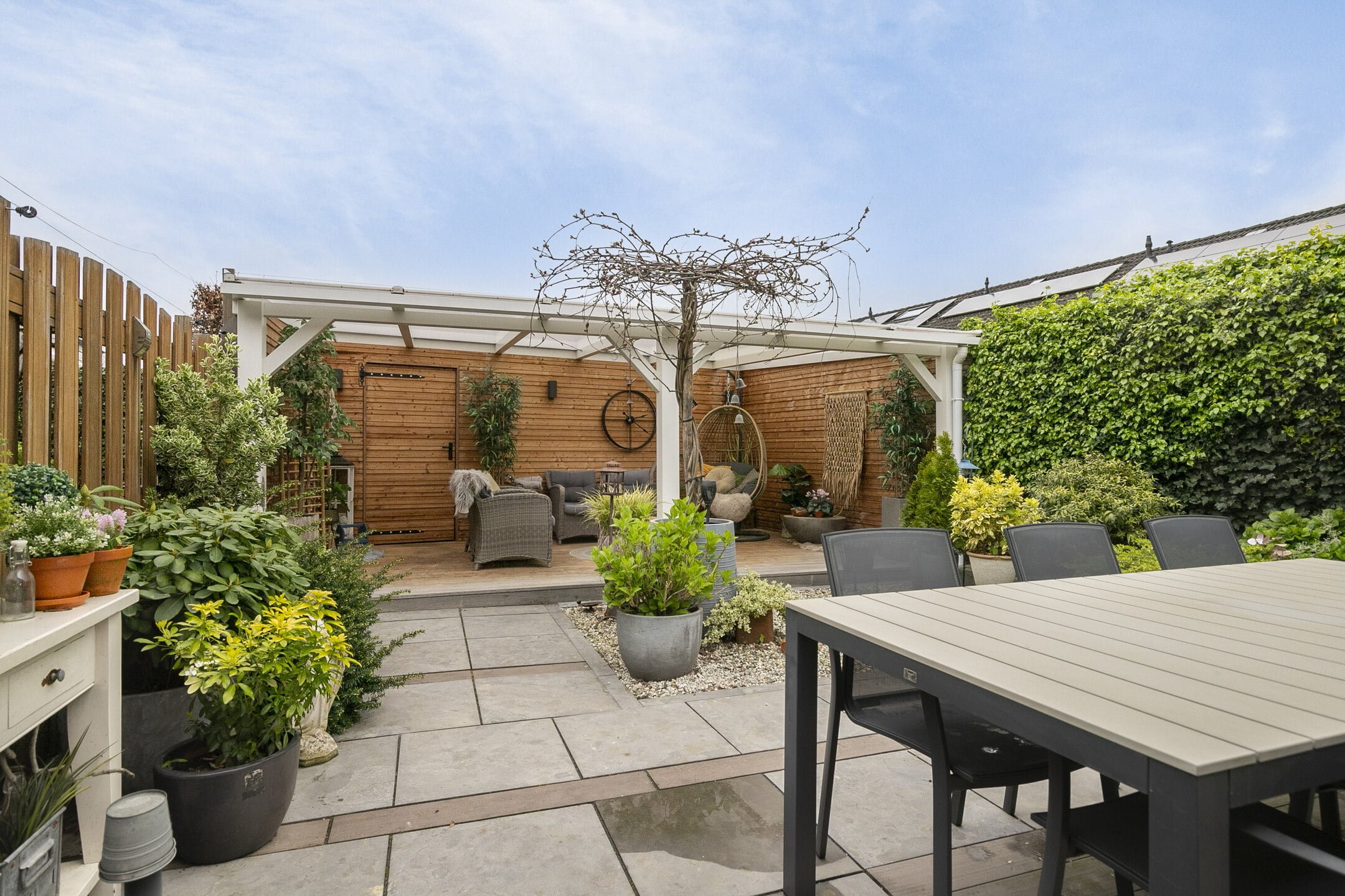 De achtertuin met achterom is fraai aangelegd met een mooie hardhouten overkapping welke de ruimte biedt om te ademen en te genieten. Hier is privacy het toverwoord. Een prachtig en ruim aangelegd terrein nodigt uit tot ontspannen. Stel je voor: een terras voor zomerse diners en gezelligheid.