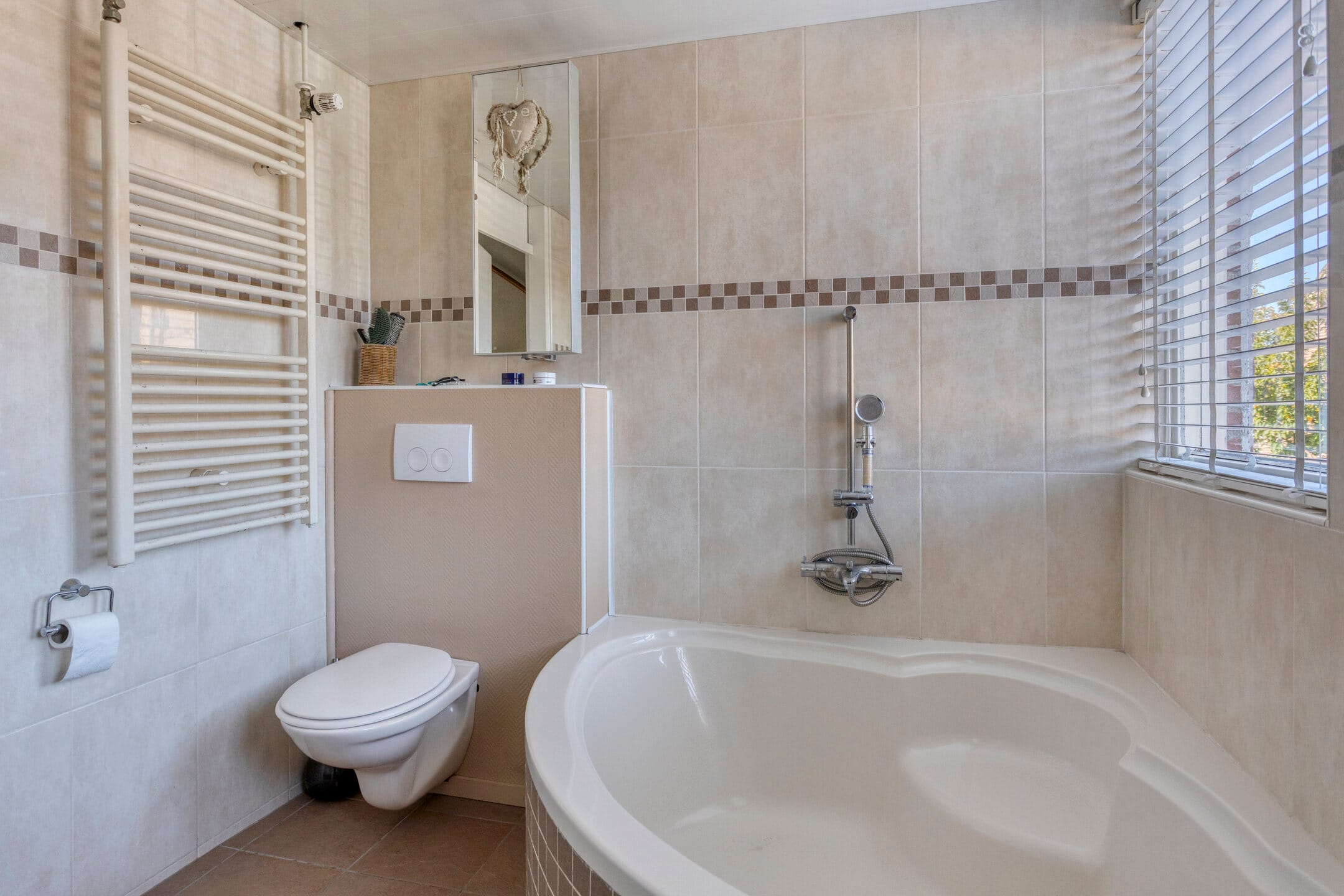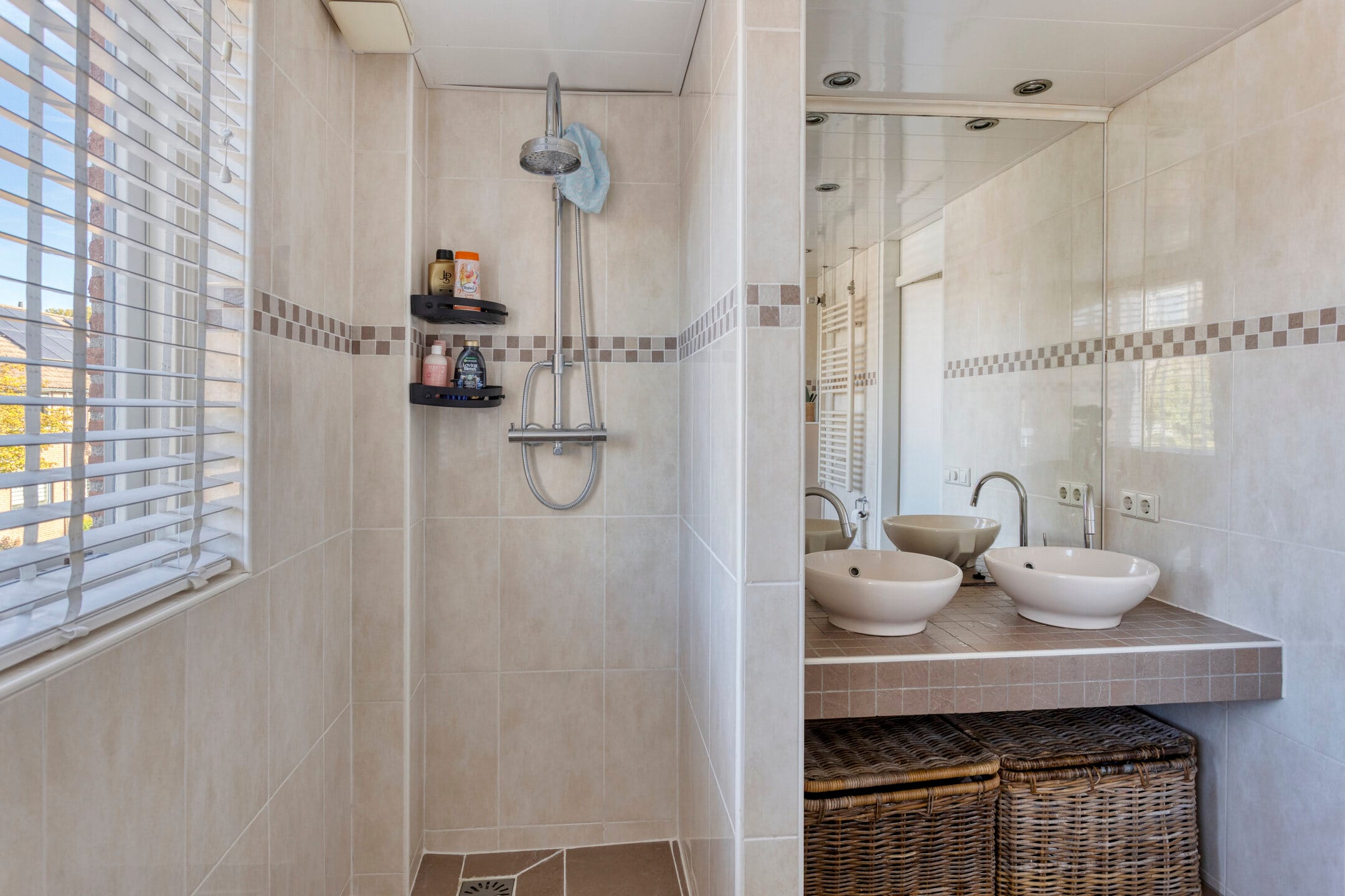 Via de trap kom je op de overloop met toegang tot 2 slaapkamers. De moderne badkamer is voorzien van een inloopdouche, ligbad, dubbele wastafel en tweede toilet. Op de eerste verdieping ligt een laminaatvloer.